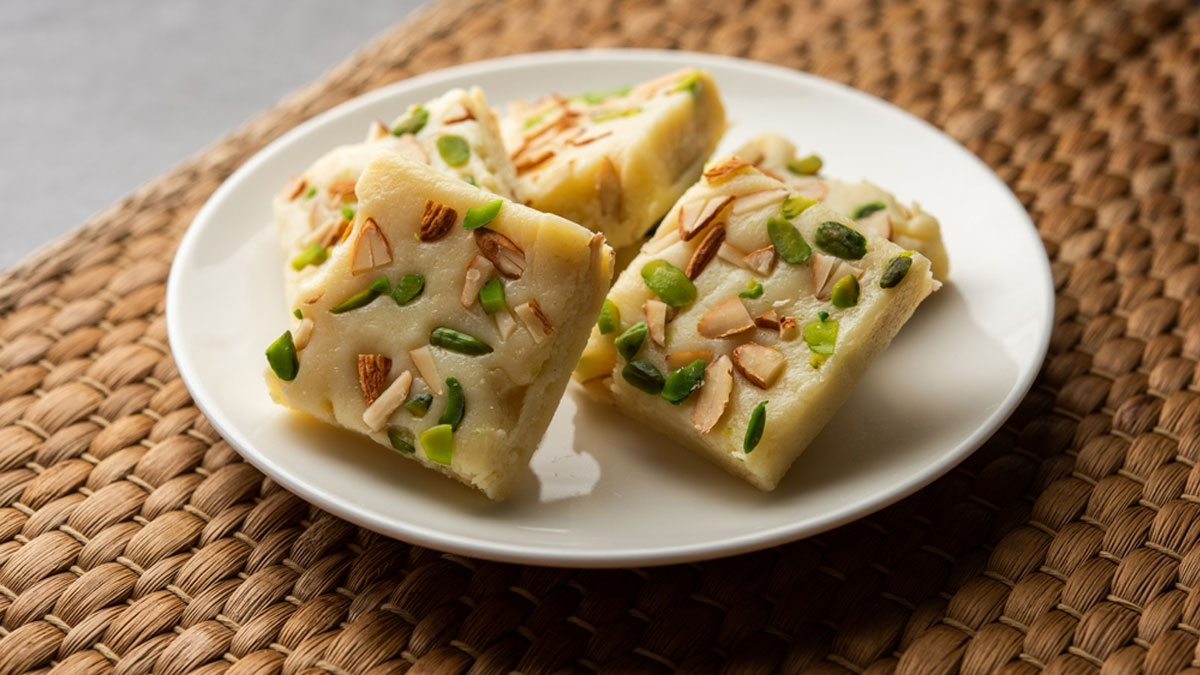 বাদাম হালকা করে ভেজে নিন। এরপর পরিষ্কার পানিতে ভিজিয়ে রাখুন কয়েক ঘণ্টা। এরপর পানি ফেলে দিয়ে বাদাম ব্লেন্ড করে নিন। চুলায় প্যান বসিয়ে তাতে ঘি দিন। এরপর তাতে দিন কাজু বাদাম ও ছানা। ভালোভাবে নেড়েচেড়ে চিনি দিন। এরপর মেশান ময়দা ও এলাচ গুঁড়া। হালুয়া প্যানের গা ছেড়ে এলে নামিয়ে আগে থেকে ঘি মেখে রাখা প্লেটে ঢেলে নিন। এরপর হাত দিয়ে চেপে সমান করে পছন্দমতো আকৃতিতে কেটে নিন। উপরে কিশমিশ, কাজু ও পেস্তা দিয়ে সাজিয়ে নিতে পারেন।