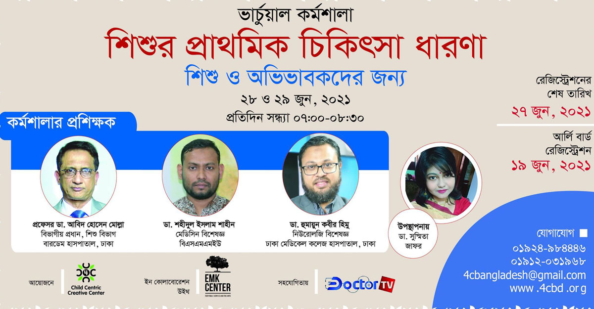 প্রাথমিক চিকিৎসার গুরুত্ব বিবেচনা করে চাইল্ড সেন্ট্রিক ক্রিয়েটিভ সেন্টার- ফোরসি আয়োজন করতে যাচ্ছে ‘শিশুর প্রাথমিক চিকিৎসা ধারণা’ বা ‘হাউ টু টিচ ফার্স্ট এইড টু চিলড্রেন’ শীর্ষক কর্মশালা। ইএমকে সেন্টারের সঙ্গে যৌথ আয়োজন এবং ডক্টর টিভির সহযোগিতায় কর্মশালাটি অনলাইনে ২৮ ও ২৯ জুন অনুষ্ঠিত হবে।