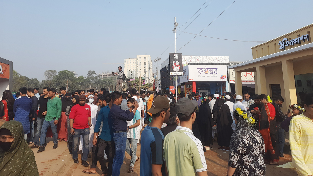 বইমেলা ঘুরে দেখা যায়, দর্শনার্থীরা সেজেগুঁজে দলবেঁধে মেলায় ঢুকছেন। তারা বিভিন্ন স্টলের সামনে দাঁড়িয়ে ছবি তুলছেন। কেউ কেউ কোনো স্টল বা প্যাভিলিয়নের সামনে বই হাতে নিয়ে ছবি তুলছেন। কিন্তু এরপর বই না কিনেই তারা বিদায় নিচ্ছেন। বিক্রয় কর্মী ও প্রকাশকদের মতে, গতবছরও পাঠকের এমন খরা ছিল না।