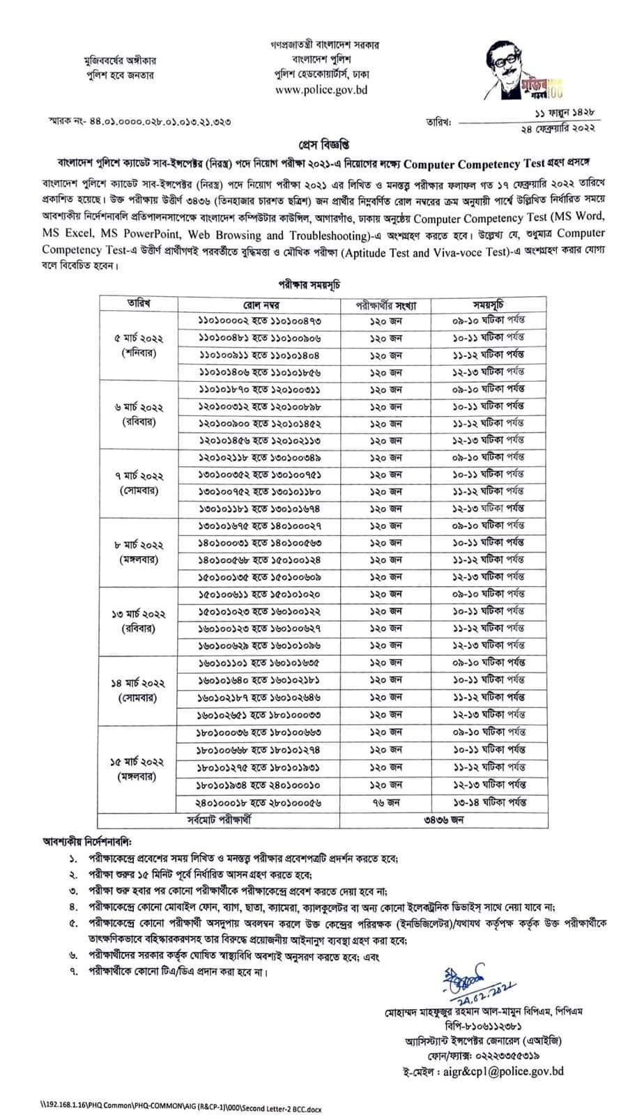 পুলিশ সদরদপ্তর জানায়, এসআই নিয়োগে লিখিত ও মনস্তত্ত্ব পরীক্ষায় উত্তীর্ণ ৩ হাজার ৪৩৬ জন প্রার্থীর কম্পিউটার দক্ষতা পরীক্ষা আগামী ৫-১৫ মার্চ ২০২২ তারিখে ঢাকার বাংলাদেশ কম্পিউটার কাউন্সিলে অনুষ্ঠিত হবে।
