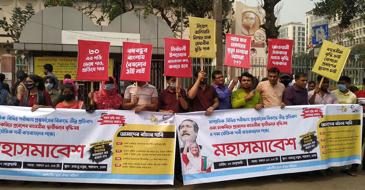 চাকরিতে প্রবেশের বয়সসীমা স্থায়ীভাবে বৃদ্ধিসহ চার দফা দাবি বাস্তবায়নের লক্ষ্যে মহাসমাবেশ করেছে সর্বদলীয় ছাত্র ঐক্য পরিষদ।