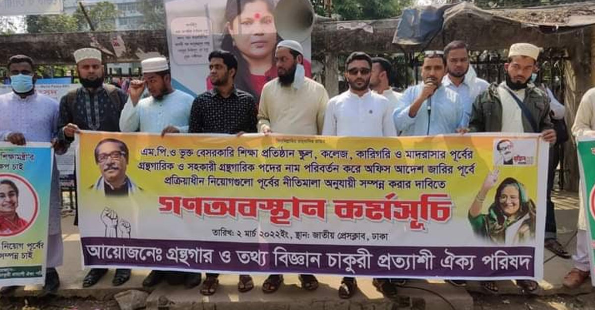 এমপিওভুক্ত বেসরকারি শিক্ষাপ্রতিষ্ঠানে গ্রন্থাগারিক ও সহকারী গ্রন্থাগারিক পদে আগের নিয়মে নিয়োগের দাবিতে জাতীয় প্রেস ক্লাবের সামনে গণঅবস্থান কর্মসূচি পালিত হয়েছে।