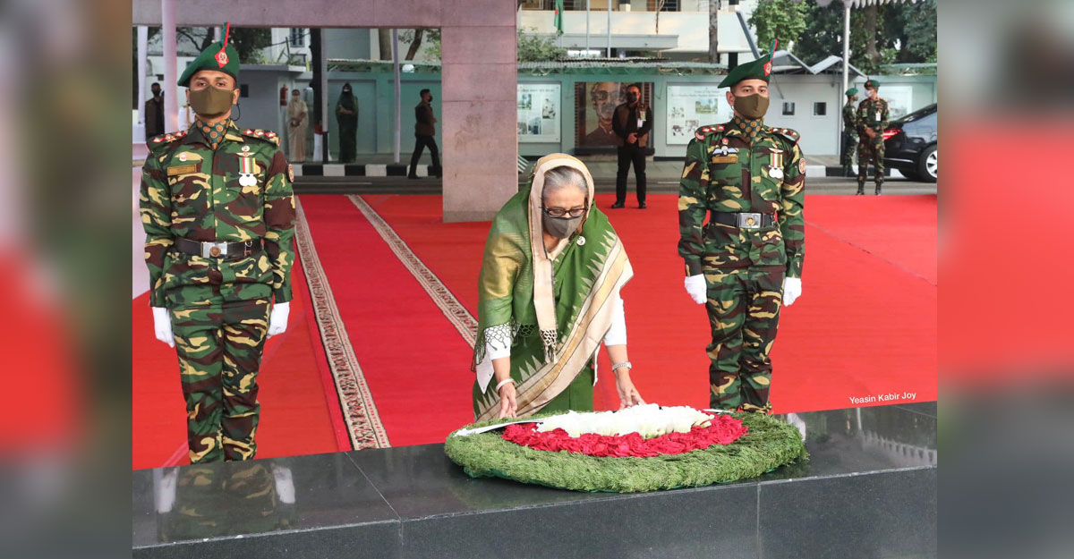 আজ সোমবার সকালে ধানমন্ডির ৩২ নম্বরে বঙ্গবন্ধুর প্রতিকৃতিতে ফুল দিয়ে মহান এ নেতার প্রতি শ্রদ্ধা জানান প্রধানমন্ত্রী।