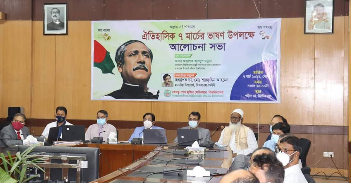 ঐতিহাসিক ৭ই মার্চের ভাষণের মাধ্যমেই স্বাধীন বাংলাদেশ অর্জিত হয়েছে বলে মন্তব্য করেছেন বঙ্গবন্ধু শেখ মুজিব মেডিকেল বিশ্ববিদ্যালয়ের (বিএসএমএমইউ) উপাচার্য অধ্যাপক ডা. মো. শারফুদ্দিন আহমেদ। তিনি বলেছেন, বঙ্গবন্ধুর ওই ভাষণে বাঙালি জাতি উদ্বুদ্ধ হয়ে মহান স্বাধীনতা যুদ্ধে ঝাঁপিয়ে পড়েছিল। যার ফলশ্রুতিতে স্বাধীন বাংলাদেশ অর্জিত হয়েছে।