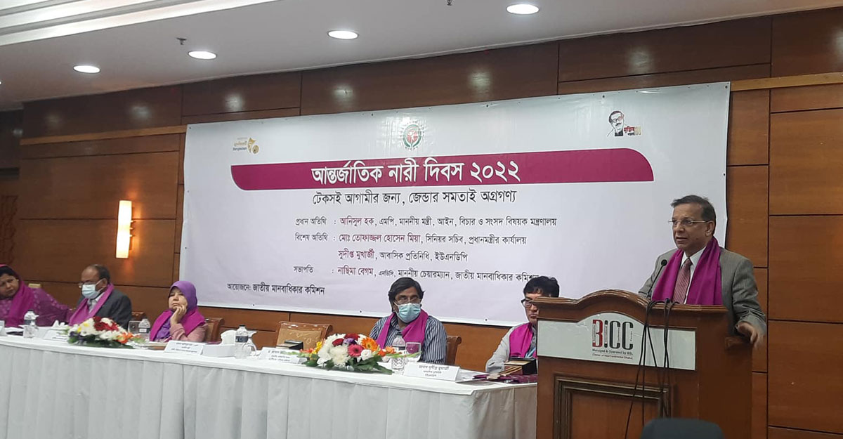 প্রধান অতিথির বক্তব্যে আইনমন্ত্রী বলেন, জেন্ডার-ইকুয়ালিটির ক্ষেত্রে অত্যন্ত তৎপর প্রধানমন্ত্রী শেখ হাসিনা। বঙ্গবন্ধু শেখ মুজিবুর রহমান তার সাড়ে তিন বছরের সেবামূলক শাসনামলে সংবিধান থেকে শুরু করে কার্যক্রমে সমতা বিষয়টি অনুসরণ করেছিলেন। কিন্তু পরবর্তী সময়ে এসব অত্যন্ত নির্মম ও দুঃখজনকভাবে বাধাগ্রস্ত হয়। বঙ্গবন্ধু কন্যা শেখ হাসিনা প্রধানমন্ত্রী হিসেবে দায়িত্ব নেওয়ার পর জেন্ডার-ইকুয়ালিটির কাজ আবার শুরু করেন। বঙ্গবন্ধুর যে নির্দেশনা বা ফাউন্ডেশন সেটার ওপরে প্রধানমন্ত্রী কাজ করে যাচ্ছেন।