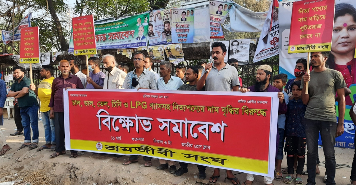 সমাবেশে বক্তারা বলেন, দিন দিন চাল, ডাল, তেল, চিনিসহ জীবন ধারণের জন্য নিত্যপ্রয়োজনীয় দ্রব্যের দাম বেড়ে চলছে। আমরা যারা কল কারখানায়, খেত-খামারে কাজ করে জীবন-জীবিকা চালাই তাদের বেঁচে থাকাই এখন অনিশ্চয়তার মধ্যে পড়েছে। এ অবস্থায় আর ঘরে বসে চুপ থাকার সময় নেই। ধনী-শ্রেণি ও সরকার মিলেমিশে আমাদের বেঁচে থাকার অধিকার অনিশ্চয়তার মধ্যে ফেলেছে।