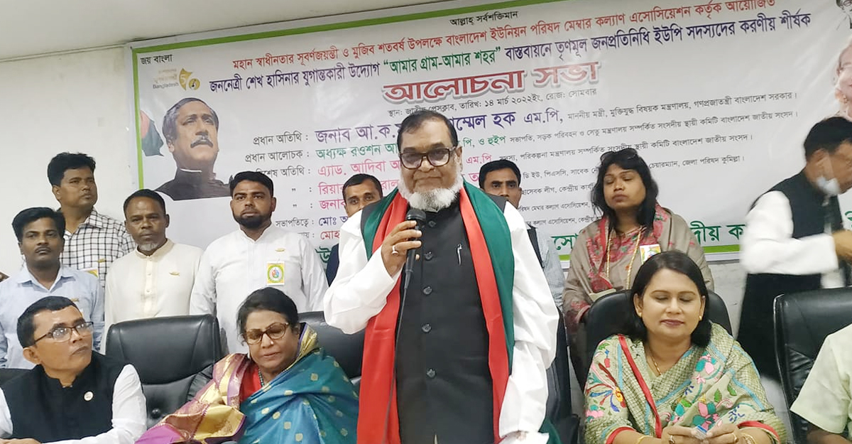 সোমবার (১৪ মার্চ) সন্ধ্যায় মহান স্বাধীনতার সুবর্ণজয়ন্তী ও মুজিব শতবর্ষ উপলক্ষে বাংলাদেশ ইউনিয়ন পরিষদ মেম্বার কল্যাণ অ্যাসোসিয়েশন আয়োজিত শেখ হাসিনার যুগান্তকারী উদ্যোগ 'আমার গ্রাম-আমার শহর' বাস্তবায়নে তৃণমূল জনপ্রতিনিধি ইউপি সদস্যদের করণীয় শীর্ষক আলোচনা সভায় তিনি এসব কথা বলেন। জাতীয় প্রেসক্লাবের আবদুস সালাম মিলনায়তনে এ আলোচনা সভা অনুষ্ঠিত হয়।