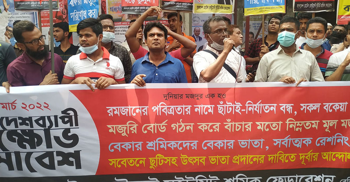 সংগঠনটির দাবিগুলো হলো- রমযানে ছাঁটাই নির্যাতন বন্ধ করতে হবে, সকল বকেয়া মজুরি পরিশোধ করতে হবে, মজুরি বোর্ড গঠন করে বাঁচার মতো নিম্নতম মূল মজুরি নির্ধারণ করতে হবে, বেকার শ্রমিকদের বেতন-ভাতা দিতে হবে, সর্বাত্মক রেশনিং ব্যবস্থা চালু করতে হবে এবং সবেতনে ছুটিসহ উৎসব ভাতা প্রদান করতে হবে।