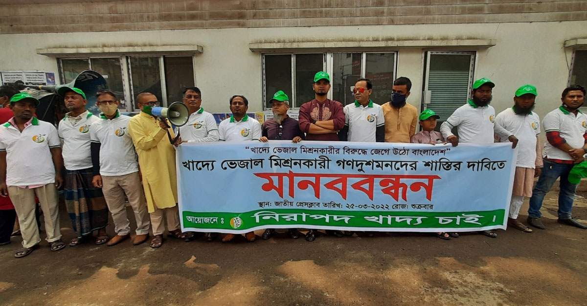 মানববন্ধনে বক্তারা বলেন, কৃত্রিমভাবে রঙ ধরে রাখতে এবং ক্রেতার আকর্ষণ বাড়াতে ফল, শাক-সবজি, মাছ, মাংসে ফরমালিন ও বিভিন্ন স্প্রে ব্যবহার করে থাকে অসাধু ব্যবসায়ীরা। যা মানব দেহের জন্য মারাত্মক ঝুঁকি, এতে মৃত্যুও ঘটাতে পারে। আসন্ন রমজানে সকল খাদ্যদ্রব্য ও ভোগ্যপণ্য ভেজালমুক্ত রাখতে নিরাপদ খাদ্য আইন ও ফরমালিন নিয়ন্ত্রণ আইন অবিলম্বে বাস্তবায়ন করতে হবে। সিয়াম সাধনার মাস রমজানে জনস্বাস্থ্যের সুরক্ষা নিশ্চিত করতে সরকারকে কঠোরভাবে প্রণীত আইনের যথাযথ প্রয়োগ করতে হবে। দেশের প্রায় সকল ভোগ্যপণ্যের মধ্যে ভোজাল ঢুকে গেছে। অধিক লাভের আশায় অধিকাংশ ব্যবসায়ী ও উৎপাদকরা খাদ্যে ভেজাল মেশাচ্ছে। শক্ত হাতে এগুলো প্রতিরোধ করা সম্ভব না হওয়ায় তা এখন ভয়াবহ আকার ধারণ করেছে।