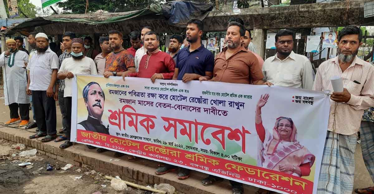 আসন্ন রমজান মাসে হোটেল শ্রমিকদের ছাঁটাই বন্ধ ও ঈদের আগেই শ্রমিকদের সব বকেয়া বেতনসহ বোনাস দেওয়ার দাবি জানিয়েছে জাতীয় হোটেল রেস্তোরাঁ শ্রমিক ফেডারেশন।
