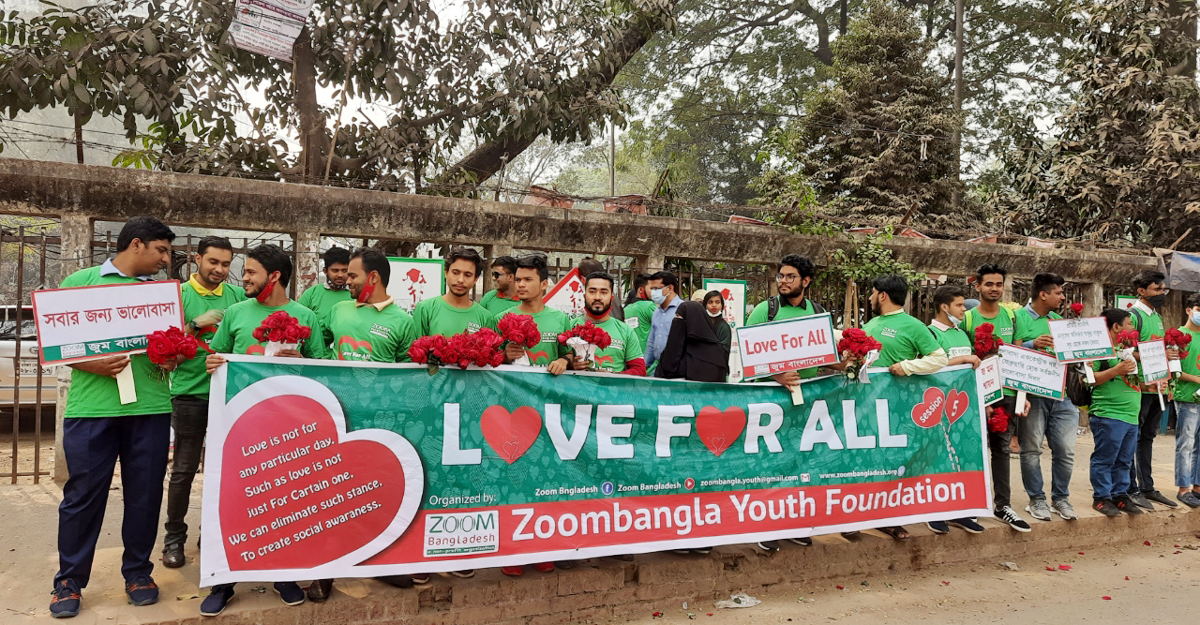 সকাল থেকে ফুল বিতরণ ও শুভেচ্ছা বিনিময় শেষে রোববার (১৪ ফেব্রুয়ারি) জাতীয় প্রেস ক্লাবের সামনে মানববন্ধন করে সংগঠনটি। এর আগে জাতীয় প্রেস ক্লাবে সাংবাদিক ও সাধারণ মানুষ, ঢাকা বিশ্ববিদ্যালয়ের টিএসসিতে সাধারণ মানুষ, চা দোকানি, নিরাপত্তা কর্মী, পুলিশ, ট্রাফিক পুলিশ ও পরিচ্ছন্নতা কর্মীসহ বিভিন্ন পেশাজীবী মানুষকে লাল গোলাপ দিয়ে শুভেচ্ছা বিনিময় করা হয়।