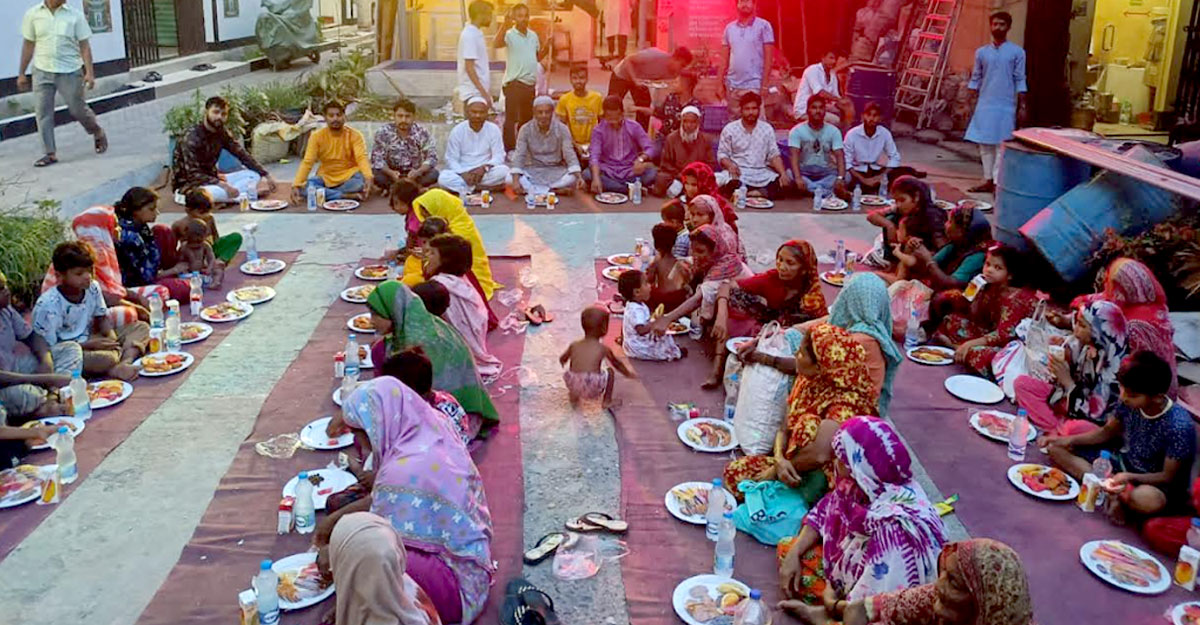 ইফতারের আগ মুহূর্তে সবার হাতে খাবার তুলে দেন এবং নিজেও তাদের সঙ্গে মেঝেতে কার্পেটে বসেই ইফতার করেন।
