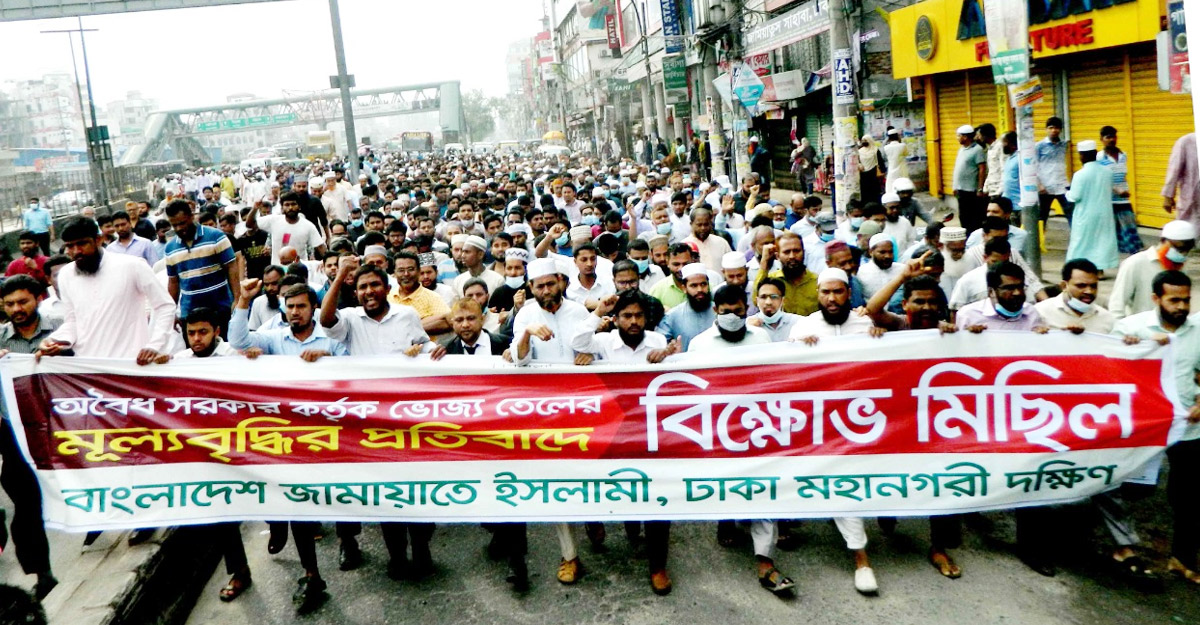 ভোজ্যতেলসহ নিত্যপ্রয়োজনীয় পণ্যের অস্বাভাবিক মূল্য বৃদ্ধির প্রতিবাদে রাজধানীতে বিক্ষোভ মিছিল ও সমাবেশ করেছে বাংলাদেশ জামায়াতে ইসলামী।