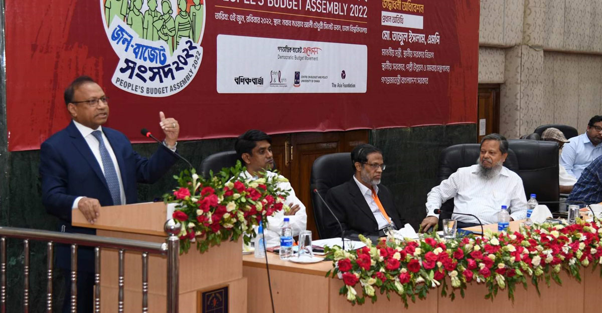 বণিক বার্তা ও গণতান্ত্রিক বাজেট আন্দোলনের যৌথ উদ্যোগে আয়োজিত ‘জন-বাজেট সংসদ ২০২২’-এ ঢাকা বিশ্ববিদ্যালয়ের কোষাধ্যক্ষ অধ্যাপক মমতাজ উদ্দীন আহমেদের সভাপতিত্বে বিশেষ অতিথি হিসেবে উপস্থিত ছিলেন ঢাকা বিশ্ববিদ্যালয়ের অর্থনীতি বিভাগের অধ্যাপক ও চেয়ারম্যান ড. এম এম আকাশ, রাজস্ব বোর্ডের সাবেক চেয়ারম্যান ড. মুহাম্মদ আব্দুল মজিদ, দ্য এশিয়া ফাউন্ডেশনের কান্ট্রি রিপ্রেজেন্টেটিভ কাজী ফয়সাল বিন সিরাজ।