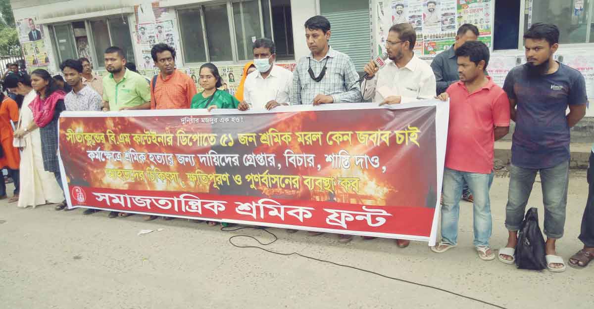 সীতাকুণ্ডে বিএম কনটেইনার ডিপোতে বিস্ফোরণে মৃত্যু এবং চার শতাধিক আহত হওয়ার ঘটনায় দায়ীদের গ্রেপ্তার, বিচার এবং দৃষ্টান্তমূলক শাস্তির দাবি জানিয়েছে সমাজতান্ত্রিক শ্রমিক ফ্রন্ট।