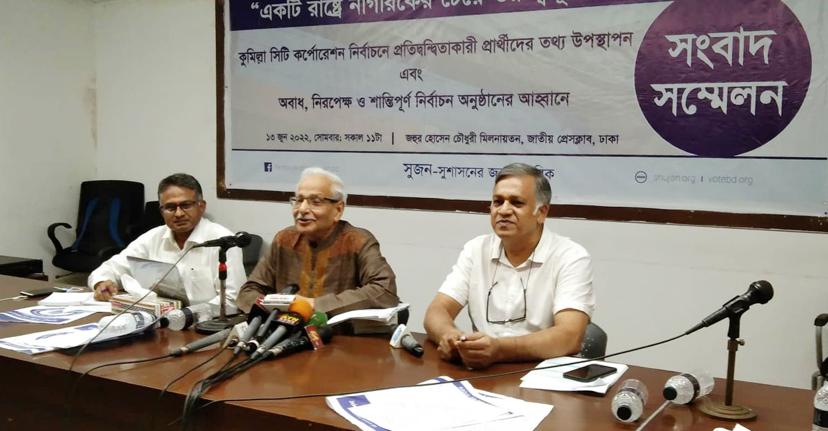 সোমবার (১৩ জুন) জাতীয় প্রেস ক্লাবের জহুর হোসেন চৌধুরী মিলনায়তনে কুমিল্লা সিটি করপোরেশন নির্বাচনে প্রতিদ্বন্দ্বী প্রার্থীদের তথ্য উপস্থাপন এবং অবাধ নিরপেক্ষ ও শান্তিপূর্ণ নির্বাচন পরিচালনার আহ্বানে সুজন আয়োজিত সংবাদ সম্মেলনে তিনি এসব কথা বলেন।