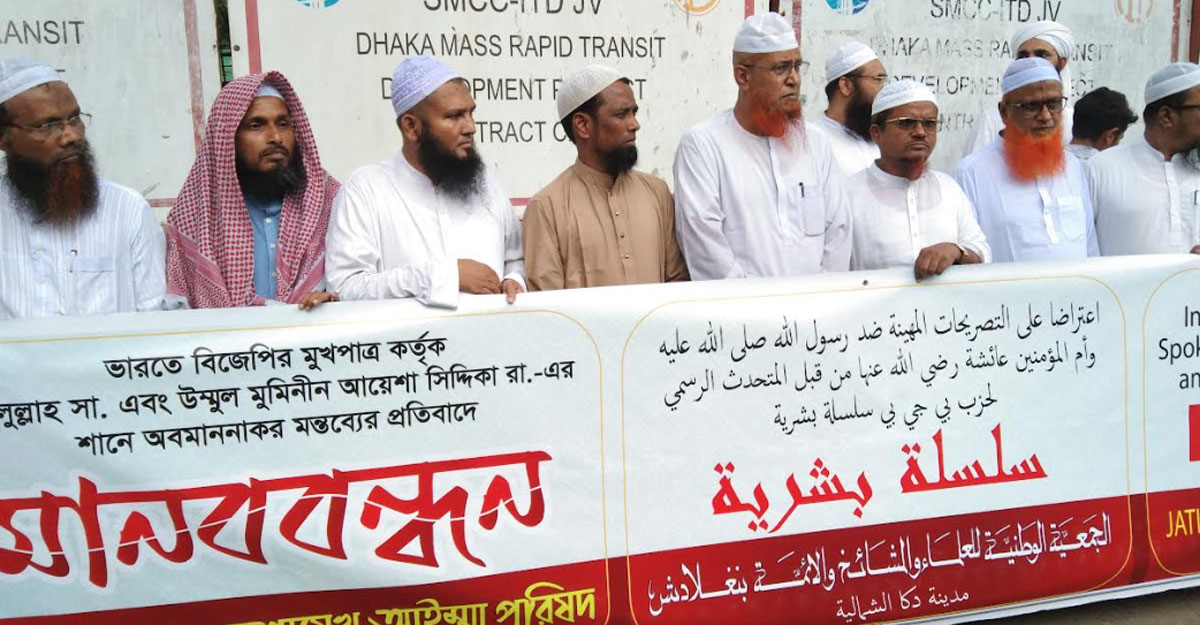 মহানবী হযরত মুহাম্মদ (সা.) ও হযরত আয়েশা (রা.)-কে নিয়ে ভারতের ক্ষমতাসীন দল বিজেপির মুখপাত্র নুপুর শর্মা ও দিল্লি শাখার গণমাধ্যম প্রধান নবীন কুমার জিন্দালের কটূক্তির প্রতিবাদে মানববন্ধন কর্মসূচি পালন করেছে জাতীয় ওলামা মাশায়েখ আইম্মা পরিষদ।