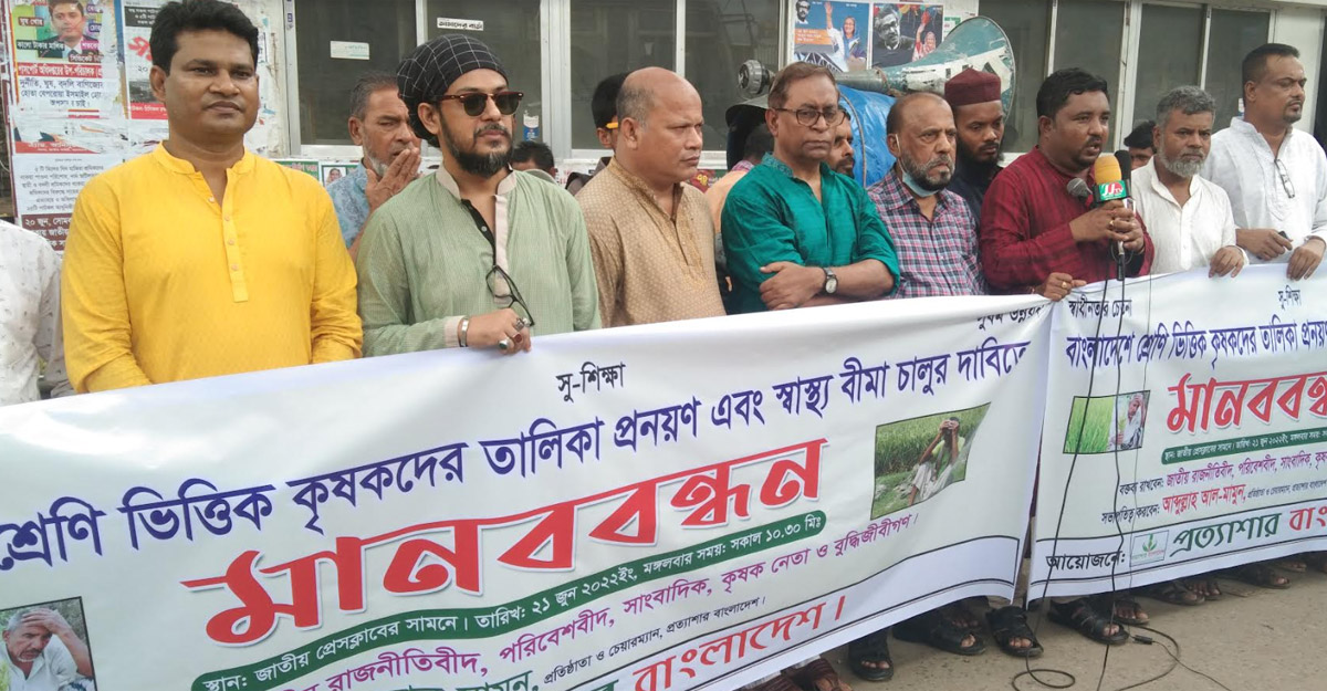 শ্রেণি ভিত্তিক কৃষকের তালিকা প্রণয়ন এবং স্বাস্থ্য বীমা চালুর দাবিতে মানববন্ধন করেছে প্রত্যাশার বাংলাদেশ নামে একটি সংগঠন।