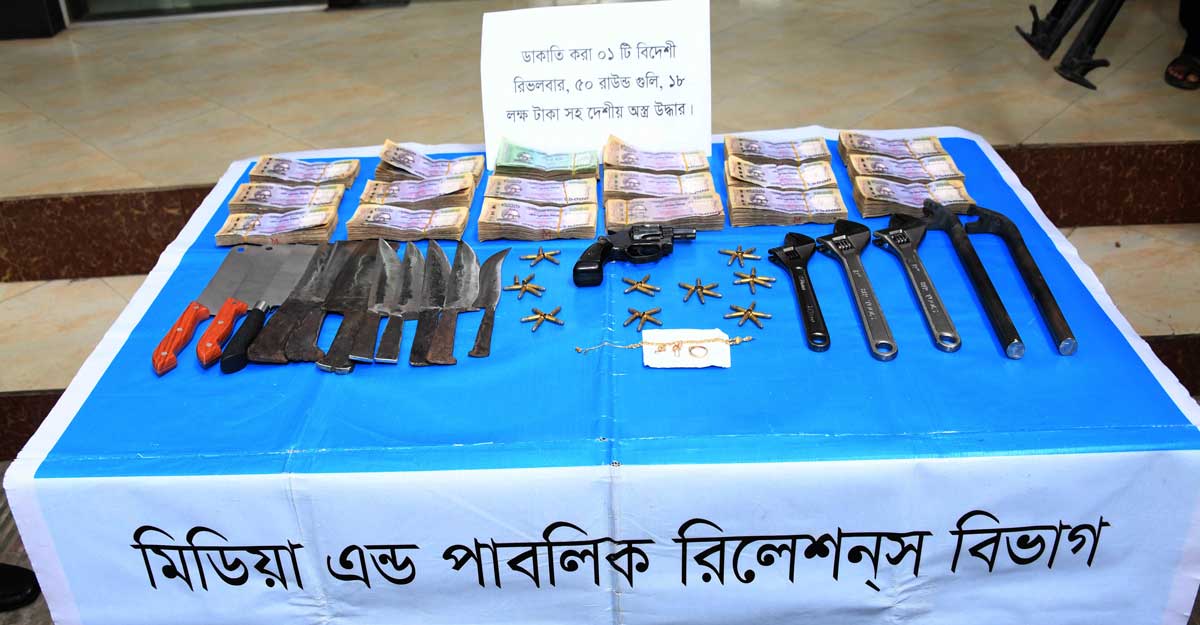 এ সময় তাদের কাছ থেকে লুণ্ঠিত একটি বিদেশি রিভলবার, ৫০ রাউন্ড গুলি, স্বর্ণালংকার, লুণ্ঠিত স্বর্ণ বিক্রির ১৮ লাখ টাকা এবং ডাকাতির কাজে ব্যবহৃত গ্রিল কাটার যন্ত্রপাতি, চাপাতি, চাকু ও রেঞ্চ জব্দ করা হয়।