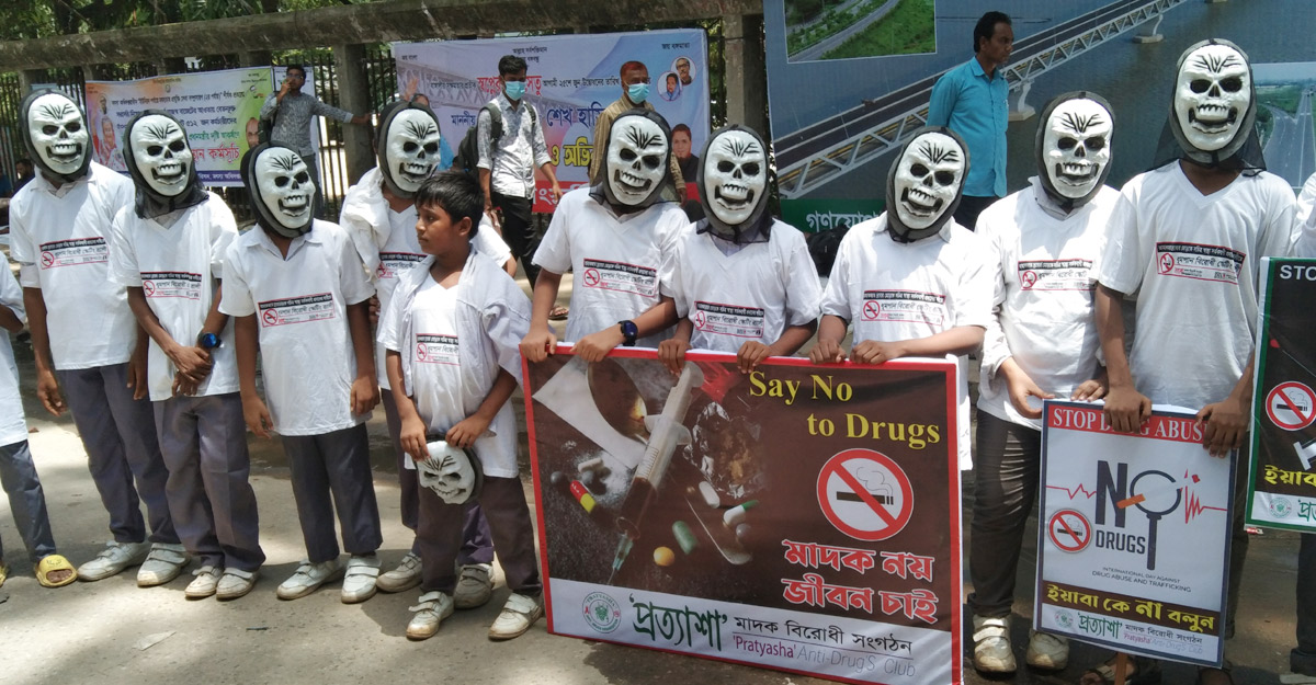আজ (২৬ জুন) দুপুরে জাতীয় প্রেস ক্লাবের সামনে প্রত্যাশা মাদকবিরোধী সংগঠনের ব্যানারে এই মানববন্ধন করে গেন্ডারিয়া মহিলা সমিতি স্কুলের ষষ্ঠ ও সপ্তম শ্রেণির শিক্ষার্থীরা। এসময় তাদের মুখে কঙ্কালের মুখোশ ও হাতে প্ল্যাকার্ড দেখা যায়।