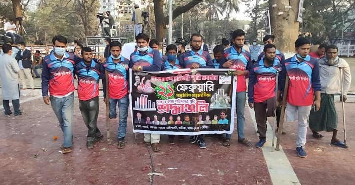 ব্যানারে দেখা যায়, ‘বাংলাদেশ প্রতিবন্ধী স্মৃতি সংগঠন, একুশে ফেব্রুয়ারি আন্তর্জাতিক মাতৃভাষা দিবস, সকল ভাষা শহীদদের প্রতি শ্রদ্ধাঞ্জলি।’