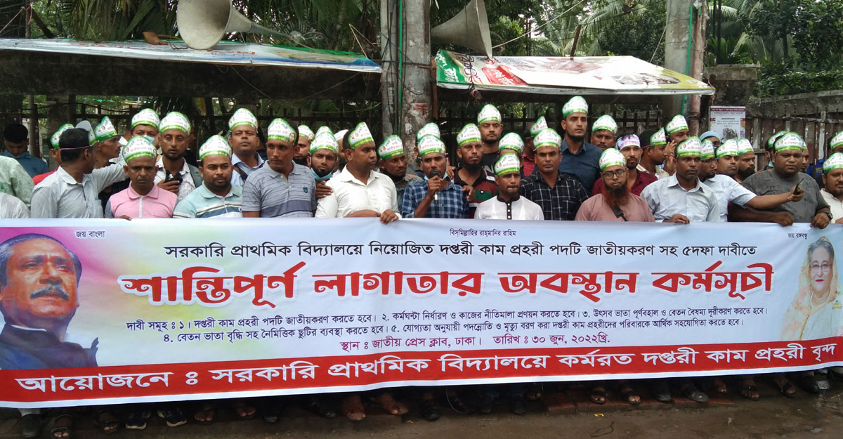 সরকারি প্রাথমিক বিদ্যালয়ে কর্মরত ৩৭ হাজার দপ্তরি কাম প্রহরীর চাকরি রাজস্ব খাতে স্থানান্তর ও অবিলম্বে আইনানুযায়ী কর্মঘণ্টা নির্ধারণসহ ৫ দফা দাবিতে অবস্থান কর্মসূচি পালন করছে বাংলাদেশ সরকারি প্রাথমিক বিদ্যালয় দপ্তরি কাম প্রহরীরা।