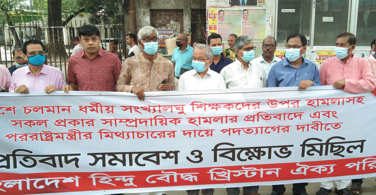 শনিবার (২ জুন) জাতীয় প্রেস ক্লাবের সামনে সংখ্যালঘু শিক্ষকদের ওপর হামলা ও পররাষ্ট্রমন্ত্রীর পদত্যাগের দাবিতে আয়োজিত এক প্রতিবাদ সমাবেশ ও বিক্ষোভ মিছিল থেকে মন্ত্রীর পদত্যাগ চান সংগঠনটির নেতারা। বাংলাদেশ শিক্ষক ঐক্য পরিষদ, যুব ঐক্য পরিষদ, ছাত্র ঐক্য পরিষদ, সনাতন সংগঠনসহ বিভিন্ন সংখ্যালঘু সংগঠনের সদস্যরা সমাবেশে অংশ নেন।