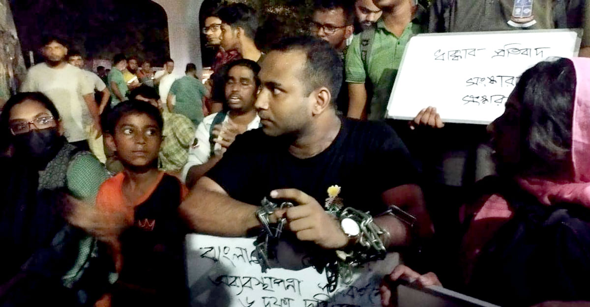 রেলওয়ের অব্যবস্থাপনা বন্ধের দাবিতে আন্দোলনরত ঢাকা বিশ্ববিদ্যালয়ের থিয়েটার অ্যান্ড পারফরম্যান্স স্টাডিজ বিভাগের চতুর্থ বর্ষের শিক্ষার্থী মহিউদ্দিন রনি এবার শাহবাগে অবস্থান নিয়েছেন।