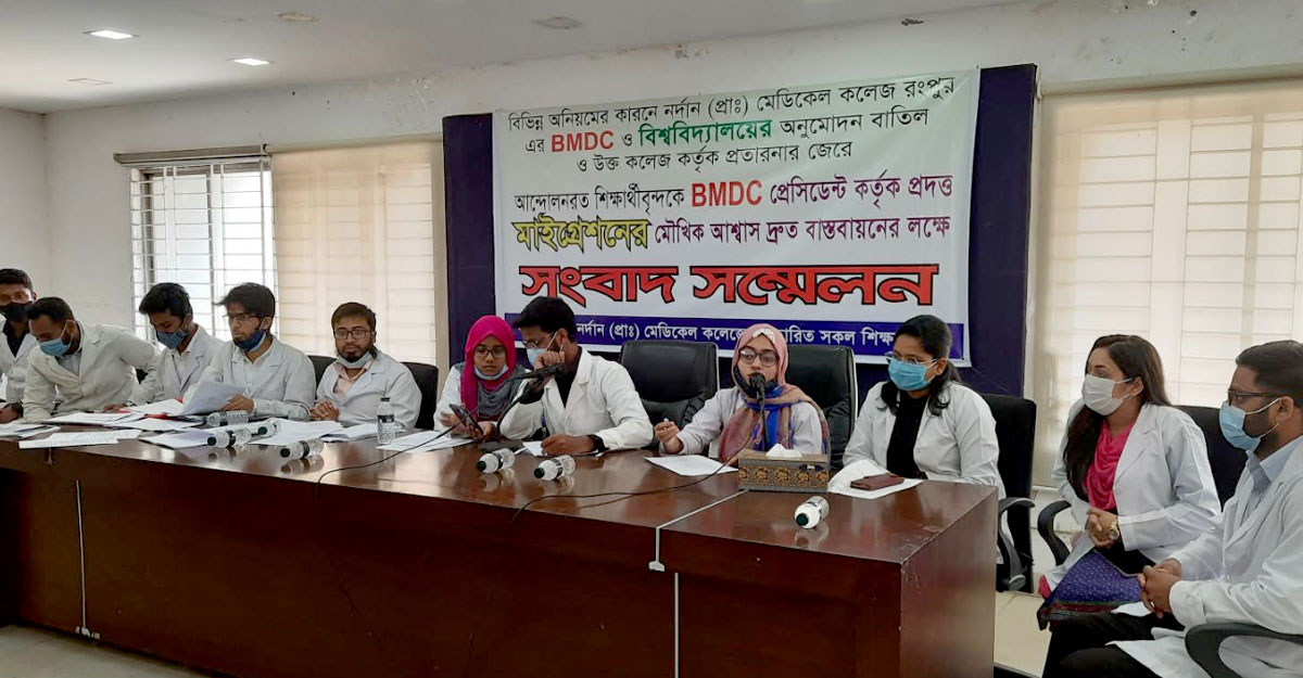 সংবাদ সম্মেলনে রংপুরের নর্দার্ন প্রাইভেট মেডিকেল কলেজের শিক্ষার্থীরা