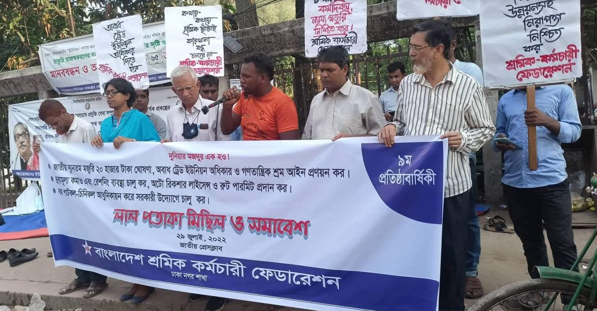 বক্তারা আরও বলেন, দেশে দোকান কর্মচারী, হোটেল কর্মচারী, গৃহ পরিচারিকা, পরিবহন শ্রমিকসহ অসংগঠিত সেক্টরের শ্রমিকদের নির্দিষ্ট কোনো কর্মঘণ্টা নেই। স্বল্প মজুরিতে দৈনিক ১২-১৬ ঘণ্টা পর্যন্ত মালিকরা মর্জিমাফিক তাদের কাজ করাচ্ছে অন্যথায় ছাঁটাই করছে। এদের চাকরির নিয়োগপত্র, সুনির্দিষ্ট বেতন কাঠামো, ছুটি, কর্মস্থলে আহত হলে ক্ষতিপূরণ দেওয়ার বাধ্যবাধকতা সৃষ্টির কোন আইন দেশে নেই। সরকারের এতো উন্নয়নের কালেও সরকারি সব পাটকল এবং কয়েকটি চিনিকল বন্ধ করে দেওয়া হয়েছে।