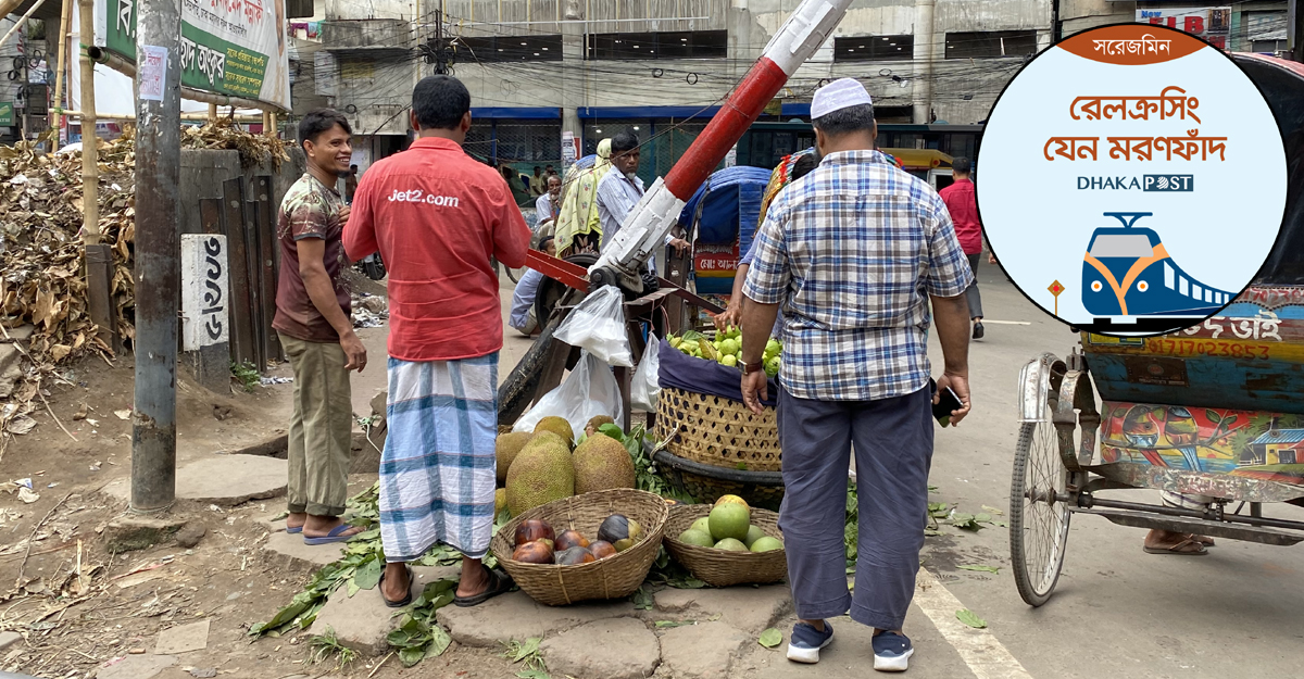 সোমবার (১ আগস্ট) দুপুর ২টা থেকে বিকেল সাড়ে ৩টা পর্যন্ত খিলগাঁও রেলক্রসিংয়ে অবস্থান করেন ঢাকা পোস্টের এই প্রতিবেদক। তিনি দেখতে পান, ক্রসিং ঘিরে গড়ে উঠেছে ফলের ভ্রাম্যমাণ দোকান। এমনকি ক্রসিং প্রতিবন্ধকের নিচেও বসেছে দোকান। এসব দোকানে অনেকটা ঝুঁকি নিয়েই চলছে কেনাবেচা।