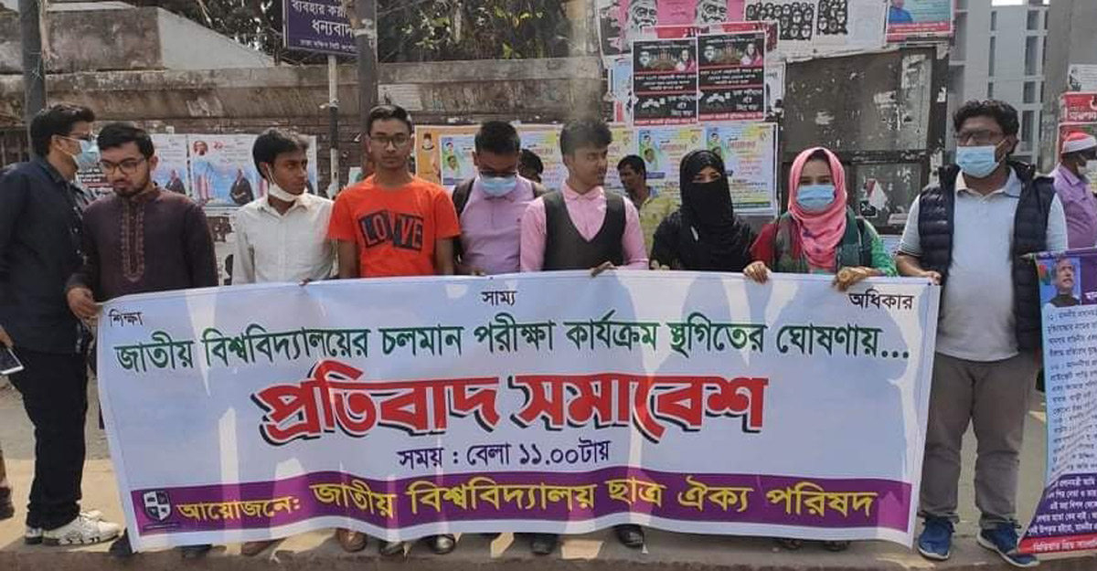 শিক্ষার্থীরা আরও বলেন, জাতীয় বিশ্ববিদ্যালয়ের ২০১৭, ২০১৮, ২০১৯, ২০২০ সেশনের মাস্টার্সে অধ্যয়নরত শিক্ষার্থীরা ২০২১ সালেও শিক্ষা সমাপনীতে পৌঁছাতে পারেনি। টানা সেশনজটের পরে যখন শিক্ষার্থীরা সংকট উত্তরণের অবস্থায় তখনই পরীক্ষা স্থগিতের মত হঠকারী সিদ্ধান্ত আমাদের শিক্ষা জীবনের কালো অধ্যায় বলে বিবেচিত হয়েছে। যেখানে বিশ্ববিদ্যালয় প্রশাসন অনার্স-মাস্টার্স পড়ুয়া শিক্ষার্থীদের স্বাস্থ্যবিধি মেনে পরীক্ষা নিয়ে আসছিলো, সেখানে কিভাবে একজন মন্ত্রী ব্যক্তি ইচ্ছার প্রতিফলন ঘটাতে পারে অবশ্যই সে প্রশ্ন আমরা করতে পারি। করোনা পরিস্থিতিতে সব সামাজিক, রাজনৈতিক, অর্থনৈতিক কার্যক্রম চলমান থাকলেও স্বাস্থ্যবিধি মেনে বিশ্ববিদ্যালয়ের শিক্ষার্থীদের পরীক্ষা স্থগিত করা কোনো সুস্থ মস্তিষ্কের মানুষের পক্ষে অন্তত মেনে নেওয়া সম্ভব নয়। আমরা মনে করছি, শিক্ষার্থীদের অকল্যাণে পরীক্ষা স্থগিত করে অন্য কোনো এজেন্ডা বাস্তবায়ন করা হচ্ছে।