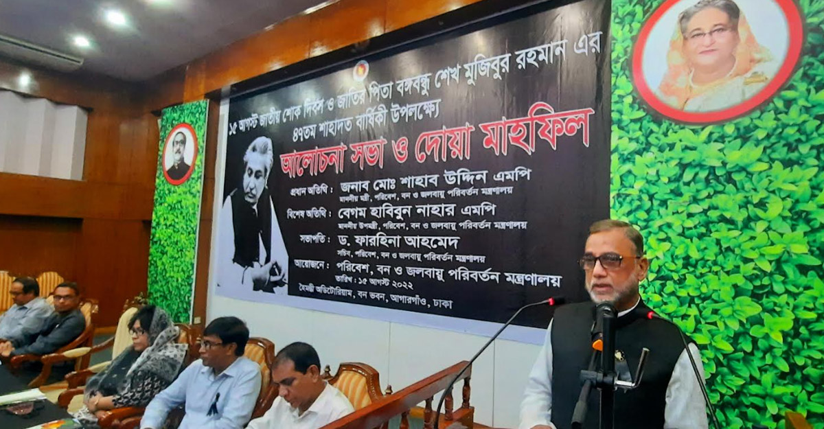 শাহাব উদ্দিন বলেন, স্বাধীনতার পরপরই বঙ্গবন্ধু যুদ্ধবিধ্বস্ত দেশ পুনর্গঠনের পাশাপাশি দেশের প্রকৃতি ও পরিবেশ রক্ষায় বিভিন্ন কার্যকরী পদক্ষেপ নিয়েছিলেন। এ লক্ষ্যে তিনি দেশজুড়ে বৃক্ষরোপণ, উপকূল সংরক্ষণে বনায়ন, বন্যপ্রাণী সংরক্ষণ, হাওর-বাঁওড়, নদ-নদী ও অন্যান্য জলাভূমি সংরক্ষণের উদ্যোগ নেন। যার ফলশ্রুতিতে বর্তমানে বাংলাদেশে পরিবেশ রক্ষায় বৃক্ষরোপণ একটি সামাজিক আন্দোলনে পরিণত হয়েছে। বঙ্গবন্ধু দূষণমুক্ত পরিবেশ নিশ্চিত করতে এবং দেশের বন, বন্যপ্রাণী ও জীববৈচিত্র্য সংরক্ষণে প্রয়োজনীয় আইন প্রণয়ন করেছিলেন।