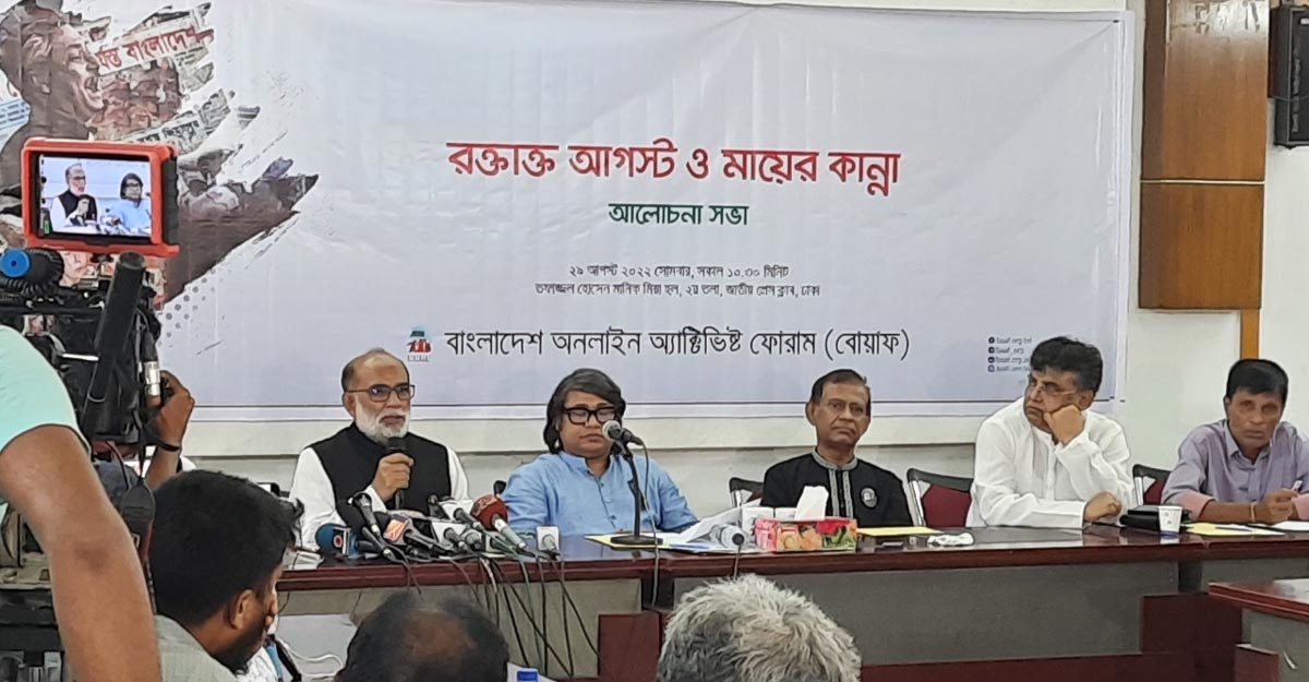 সোমবার (২৯ আগস্ট) দুপুরে জাতীয় প্রেস ক্লাবের তফাজ্জল হোসেন মানিক মিয়া হলে বাংলাদেশ অনলাইন অ্যাক্টিভিস্ট ফোরাম (বোয়াফ) আয়োজিত ‘রক্তাক্ত আগস্ট ও মায়ের কান্না’ শীর্ষক আলোচনা সভায় তিনি এসব কথা বলেন।