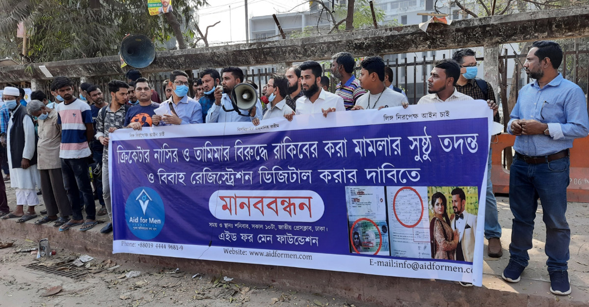 ক্রিকেটার নাসির ও তার স্ত্রী তামিমার বিরুদ্ধে রাকিবের করা মামলার সুষ্ঠু তদন্তসহ বিবাহ রেজিস্ট্রেশন ডিজিটাল করার দাবি জানিয়েছে এইড ফর মেন ফাউন্ডেশন। শনিবার (২৭ ফেব্রুয়ারি) জাতীয় প্রেসক্লাবের সামনে আয়োজিত এক মানববন্ধন থেকে এ দাবি জানানো হয়।