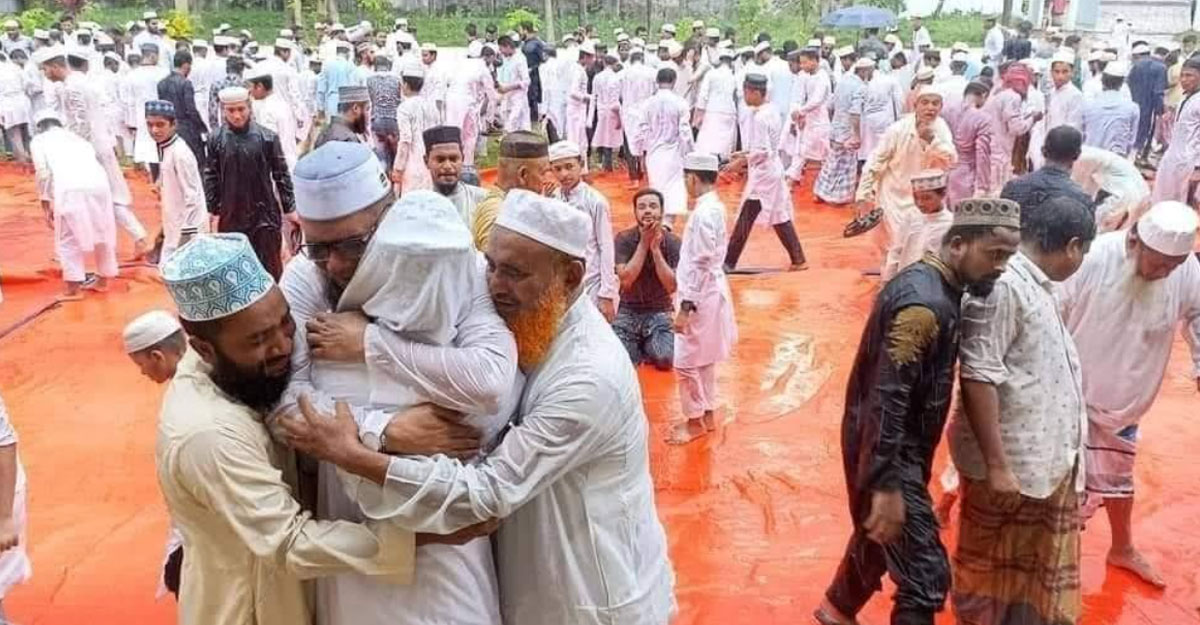 বৃষ্টি নেমে আসায় আল্লাহর প্রতি শুকরিয়া আদায় করে মুসল্লিরা একে অপরকে আলিঙ্গন করেন