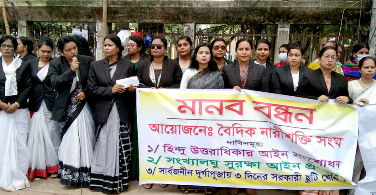 মানববন্ধনে পৈতৃক সম্পত্তিতে হিন্দু নারীর অধিকার বাস্তবায়ন, সংখ্যালঘু সুরক্ষা আইন প্রণয়ন ও দুর্গাপূজায় তিন দিনের সরকারি ছুটি ঘোষণার দাবি জানান বক্তারা।