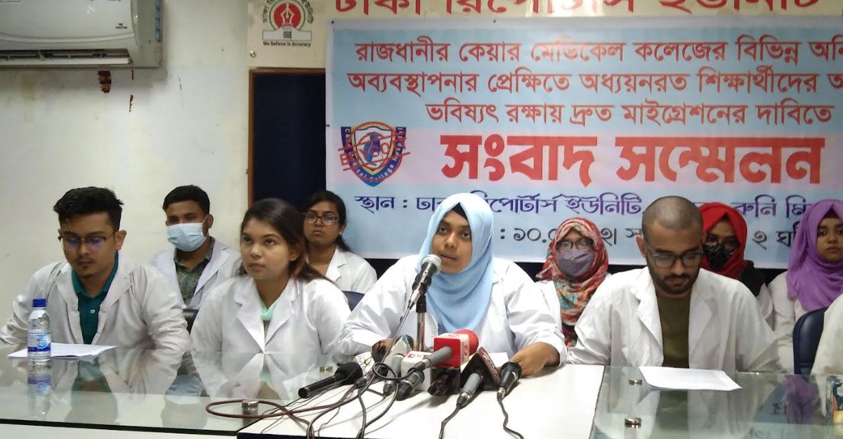 সংবাদ সম্মেলনে কেয়ার মেডিকেল কলেজের ভুক্তভোগী শিক্ষার্থীরা উপস্থিত ছিলেন।