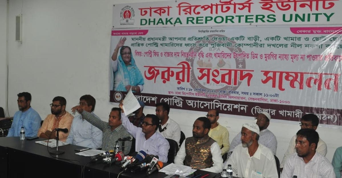 রোববার (১৮ সেপ্টেম্বর) ঢাকা রিপোর্টার্স ইউনিটির নসরুল হামিদ মিলনায়তনে এক সংবাদ সম্মেলন থেকে এসব দাবি জানান বাংলাদেশ পোল্ট্রি অ্যাসোসিয়েশনের সাধারণ সম্পাদক মো. ইলিয়াস খন্দকার।