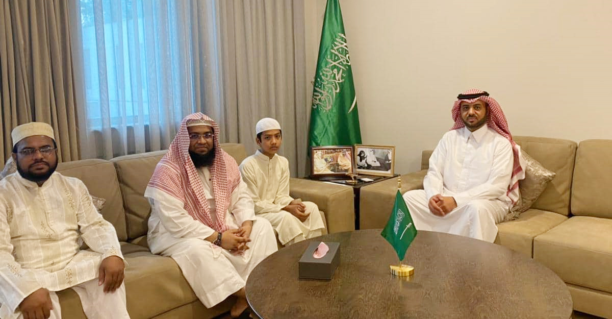 বুধবার (২৮ সেপ্টেম্বর) ঢাকার সৌদি দূতাবাসে হাফেজ সালেহ আহমেদ তাকরীম ও তার শিক্ষককে দূতাবাসে স্বাগত জানান রাষ্ট্রদূত।