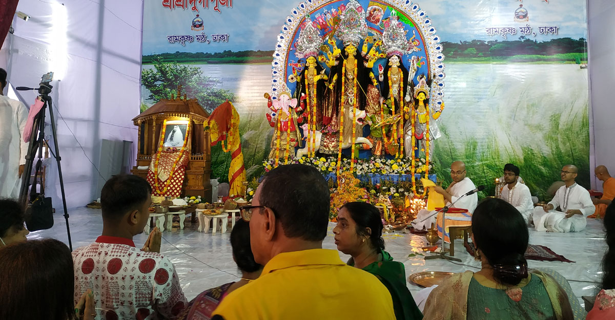 মঙ্গলবার সকালে রাজধানীর গোপীবাগের রামকৃষ্ণ মঠ ও রামকৃষ্ণ মিশনে গিয়ে দেখা যায়, দেবী দুর্গার প্রতিমার কাছে বসে পুরোহিতরা মন্ত্র উচ্চারণের মাধ্যমে পূজার কাজ করছেন। এর সঙ্গে যোগ হয়েছে ঢাকের তাল। অন্যদিকে, দর্শনার্থী-পুণ্যার্থীরা দেবী দুর্গার কাছে প্রার্থনা করছেন, প্রতিমার কাছে এসে মাথা ঠেকছেন।