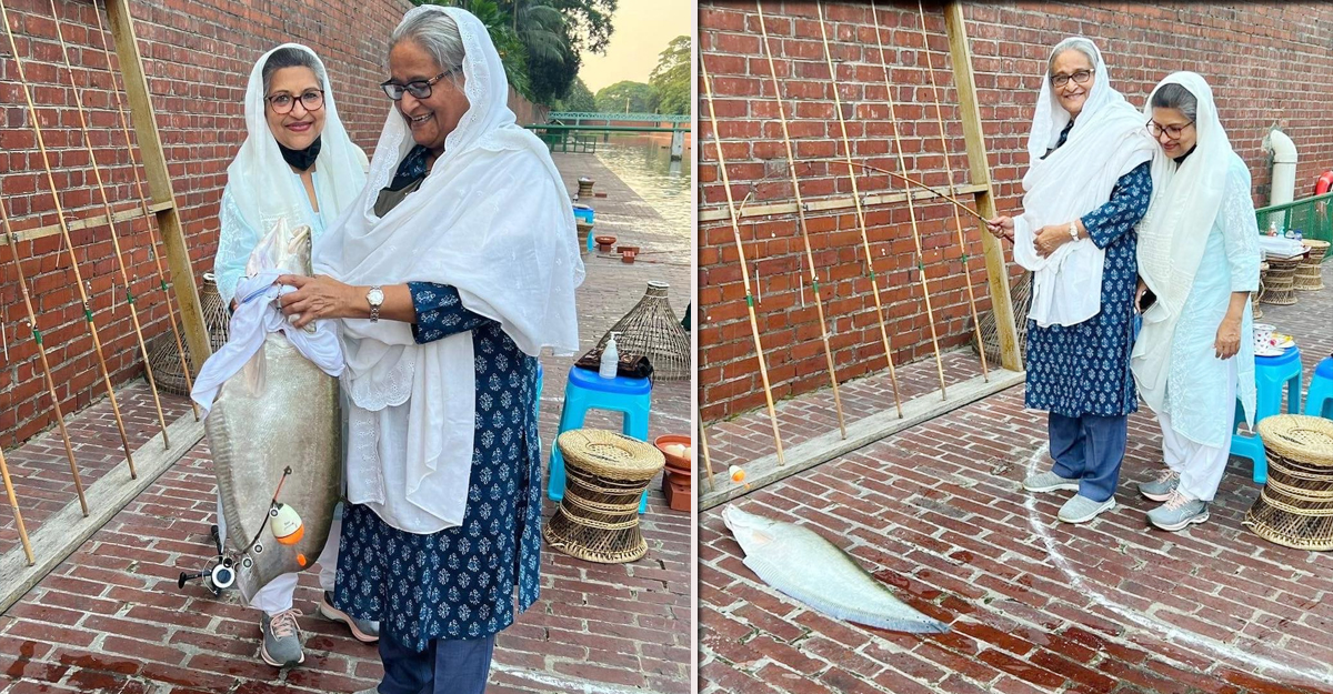 ছোট বোন শেখ রেহানাকে সঙ্গে নিয়ে গণভবনের লেকে মাছ শিকার করেছেন প্রধানমন্ত্রী শেখ হাসিনা। সে সময় বড়শিতে একটি চিতল মাছ ধরা পড়ে। মাছটি নিয়ে দুই বোনকে উচ্ছ্বাস করতে দেখা যায়।