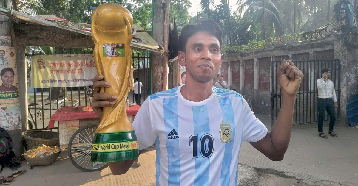 আর্জেন্টাইন ফুটবলার লিওনেল মেসির জন্য বিশ্বকাপ বানিয়েছেন বাংলাদেশের এক যুবক। মাইনুল ইসলাম নামের ওই যুবকের বাড়ি বগুড়ার শিবগঞ্জ জেলায়। ছোট বেলা থেকে তিনি আর্জেন্টিনার ভক্ত। মাইনুলের বানানো কাঠের এই বিশ্বকাপ বানাতে তার সময় লেগেছে প্রায় দেড় মাস।