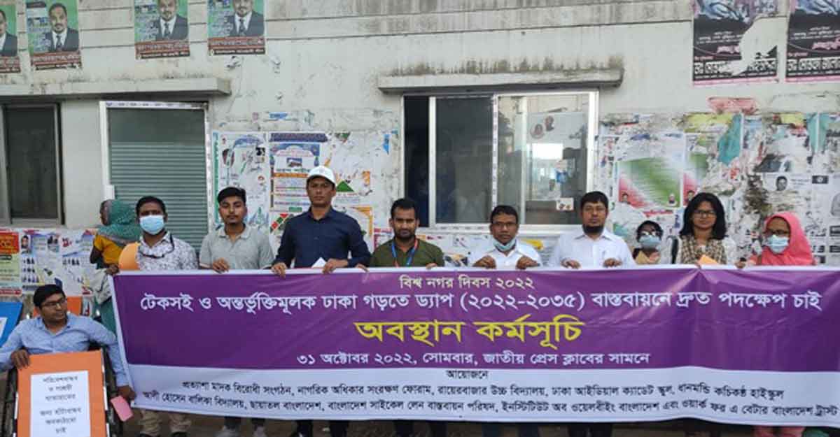 সোমবার (৩১ অক্টোবর) জাতীয় প্রেস ক্লাবের সামনে বিশ্ব নগর দিবস ২০২২ উপলক্ষে আয়োজিত 'টেকসই ও অন্তর্ভূক্তিমূলক ঢাকা গড়তে ড্যাপ বাস্তবায়নে দ্রুত পদক্ষেপ চাই' শীর্ষক অবস্থান কর্মসূচি থেকে এ দাবি জানানো হয়।