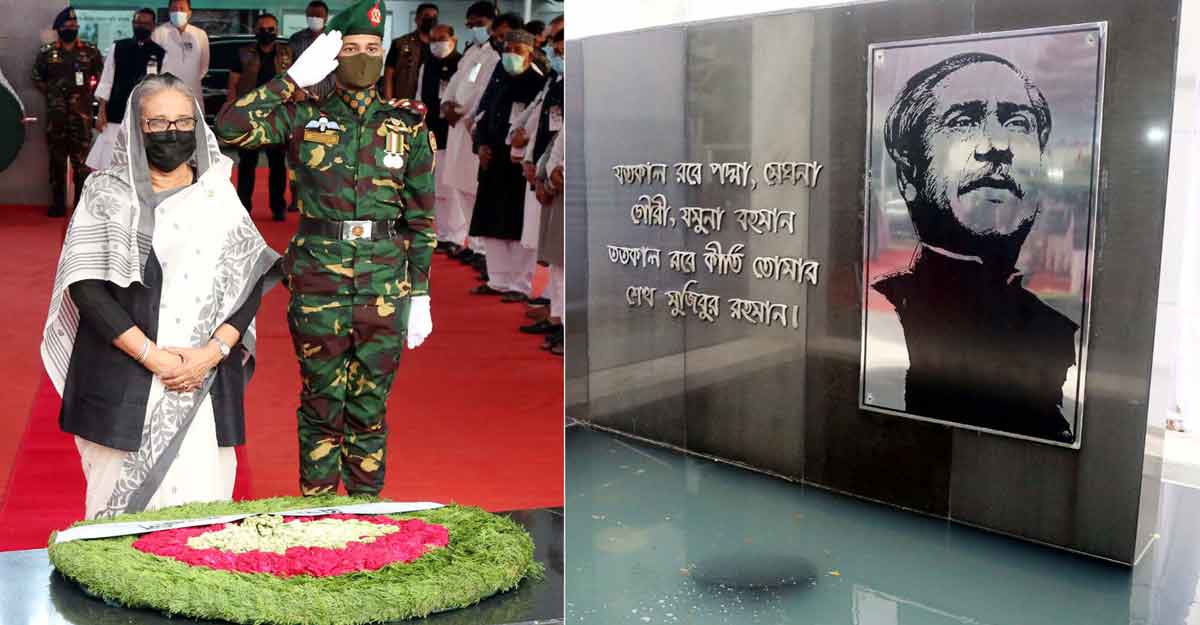 বঙ্গবন্ধুর প্রতিকৃতি ও জাতীয় ৪ নেতার কবরে প্রধানমন্ত্রীর শ্রদ্ধা