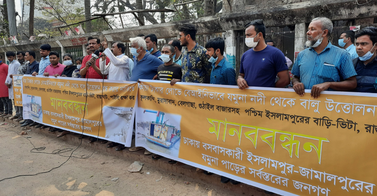 বেআইনিভাবে যমুনা নদী থেকে বালু উত্তোলন বন্ধের দাবিতে মানববন্ধন