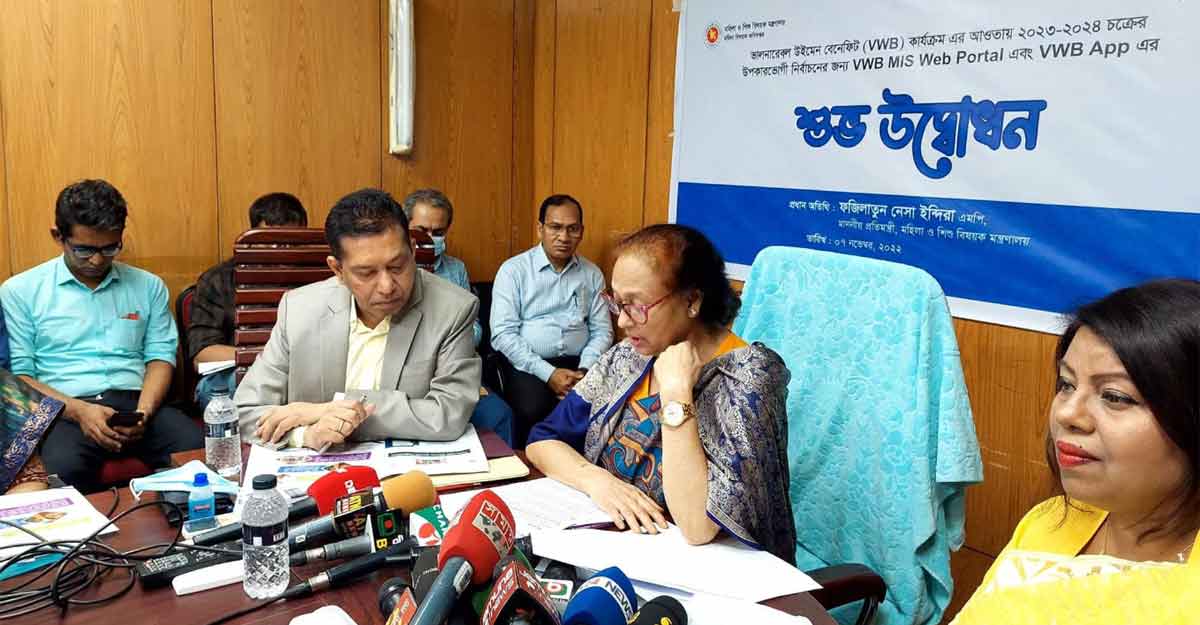 সোমবার (৭ নভেম্বর) সচিবালয়ে মহিলা ও শিশু বিষয়ক মন্ত্রণালয়ের সম্মেলন কক্ষে ভালনারেবল উইমেন বেনিফিট কার্যক্রমের (ভিডব্লিউবি) ২০২৩-২০২৪ চক্রের উপকারভোগী নির্বাচনের জন্য ভালনারেবল উইমেন বেনিফিট মিস ওয়েবপোর্টাল এবং ভালনারেবল উইমেন বেনিফিট অ্যাপ উদ্বোধন অনুষ্ঠানে প্রতিমন্ত্রী ফজিলাতুন নেসা ইন্দিরা এ তথ্য জানান।