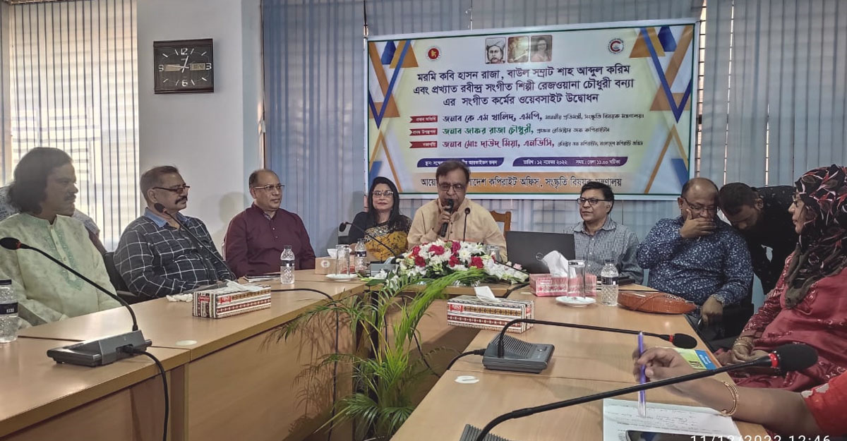 শনিবার (১২ নভেম্বর) রাজধানীর আগারগাঁওয়ে জাতীয় আর্কাইভস ভবনের সম্মেলন কক্ষে বাংলাদেশ কপিরাইট অফিস আয়োজিত ‘মরমি কবি হাসন রাজা, বাউল সম্রাট শাহ আব্দুল করিম এবং প্রখ্যাত রবীন্দ্র সংগীত শিল্পী রেজওয়ানা চৌধুরী বন্যার সংগীতকর্মের ওয়েবসাইট উদ্বোধন’ এবং রয়্যালিটির চেক হস্তান্তর অনুষ্ঠানে তিনি এসব কথা বলেন।