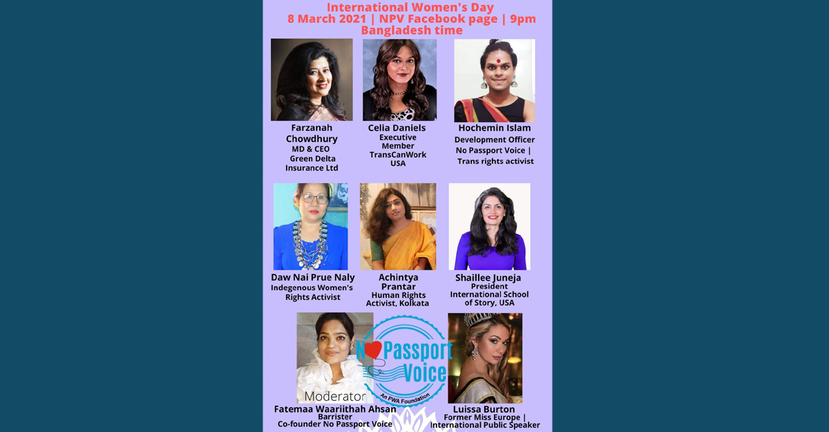 নারী দিবসে আন্তর্জাতিক সেমিনারের আয়োজন করেছে অলাভজনক বাংলাদেশি সংস্থা ‘নো পাসপোর্ট ভয়েস’। এ সেমিনারে প্রথম তিন রূপান্তরিত নারীকে (ট্রান্সজেন্ডার) আলোচক হিসেবে রাখা হয়েছে। আগামী ৮ মার্চ বাংলাদেশ সময় রাত ৯টায় ভার্চুয়ালি সেমিনারটি অনুষ্ঠিত হবে।
