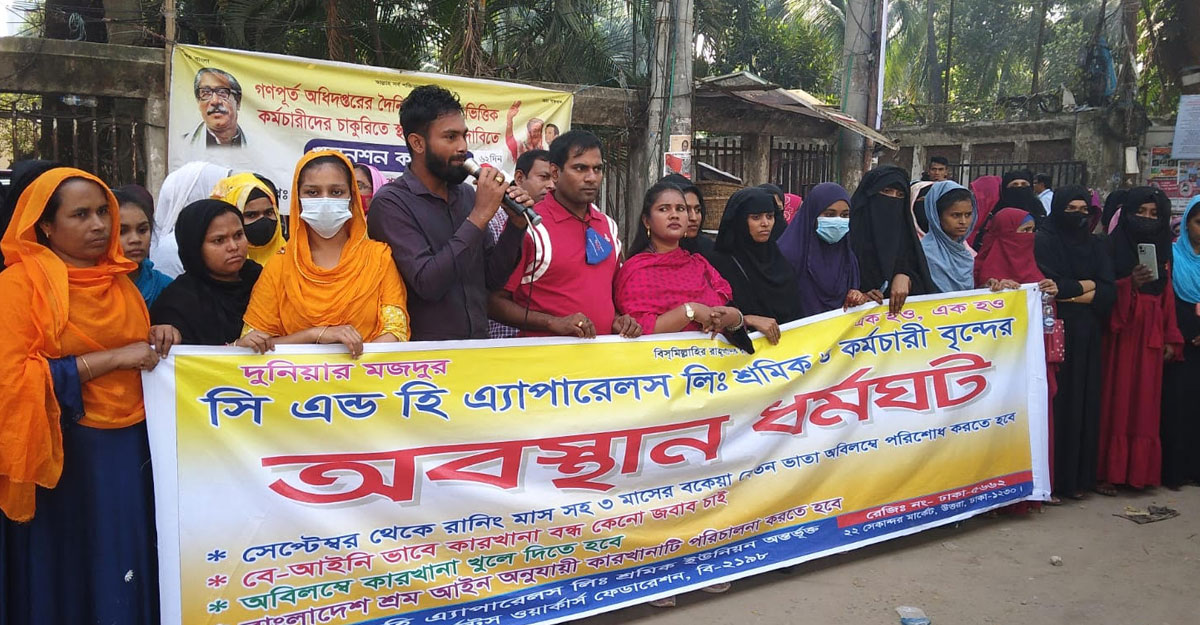বকেয়া বেতন পরিশোধের দাবিতে অবস্থান ধর্মঘট করেছেন সি অ্যন্ড হি অ্যাপারেলস লিমিটেডের শ্রমিকরা।
